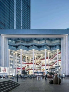 Situated at the western end of the Nanjing Road Walkway, Shimao Plaza stands at 819 East Nanjing Road, with views overlooking the Huangpu River to the east, People’s Square to the west, Yu Garden to the south, and Suzhou Creek to the north. Initially designed by Germany’s IOKP design firm and later modified by the East China Architectural Design Institute, Shimao Plaza features a unique right-angled triangular shape and serves as a prominent landmark in the district.