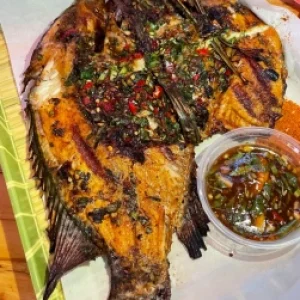Дунба Жареная рыба, уходящая корнями в культуру наси, маринуется в местных специях, готовится на древесном угле и подается с перцем чили и зеленью, предлагая ароматное, хрустящее и пряное традиционное угощение.