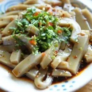 Лапша из нута — это освежающая юньнаньская закуска, приготовленная из крахмала нута. Нарезается на шелковистые полоски и подается с соусом из чили, уксуса и зелени, предлагая пикантный и острый летний вкус.