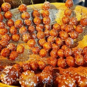 ขนมพื้นบ้านเฉิงตู ทำจากแป้งข้าวเหนียวปั้นทอดจนเหลืองกรอบ แล้วเคลือบน้ำตาลที่คาราเมล กรอบนอก นุ่มใน และหวานอร่อย เป็นขนมในวัยเด็กที่คนท้องถิ่นชื่นชอบ