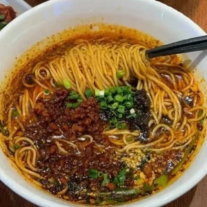 อาหารริมทางขึ้นชื่อของเสฉวน เสิร์ฟบะหมี่ราดด้วยน้ำมันพริกเผ็ด เนื้อหมูบด ผักดอง และถั่วลิสง รสชาติจัดจ้าน เปรี้ยว เค็ม และเผ็ด กลายเป็นเมนูโปรดที่กินแล้วให้ความรู้สึกอบอุ่นใจ