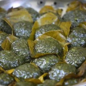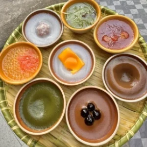 ขนมตามฤดูกาลทำจากข้าวเหนียวผสมใบไอ๋ มีกลิ่นหอมสมุนไพรและเนื้อนุ่มหนึบ กินในเทศกาลเพื่อความเป็นสิริมงคลและสุขภาพที่ดี ถือเป็นรสชาติพิเศษที่เชื่อมโยงกับประเพณีโบราณ