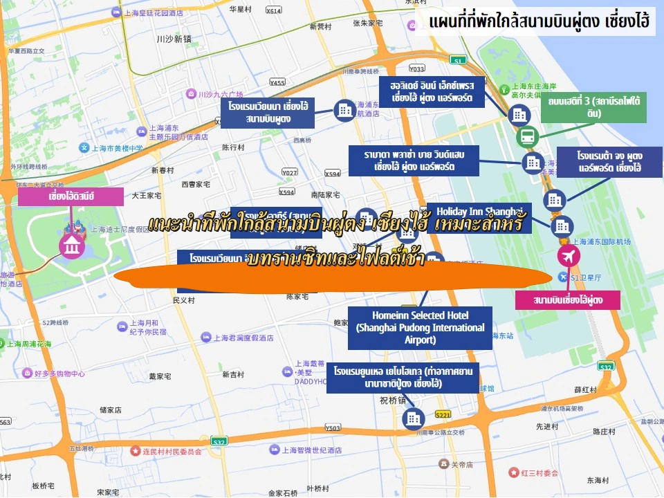 - ที่พักใกล้สนามบินผู่ตง: บริเวณรอบสนามบินมีโรงแรมมากมาย ส่วนใหญ่มีบริการรับส่งสนามบินและรถรับส่งไปสวนสนุกดิสนีย์ฟรี ใช้เวลาประมาณ 10-15 นาทีถึงสนามบินและดิสนีย์ อย่างไรก็ตาม บริเวณนี้หาร้านอาหารค่อนข้างยาก ควรสั่งเดลิเวอรีหรือหาอะไรกินให้เรียบร้อยก่อนเข้าพัก