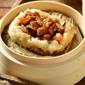 糯米雞以荷葉包裹糯米、雞肉、香菇與臘腸蒸製而成,香氣四溢,口感豐富,是點心餐桌上極受歡迎的傳統美味。