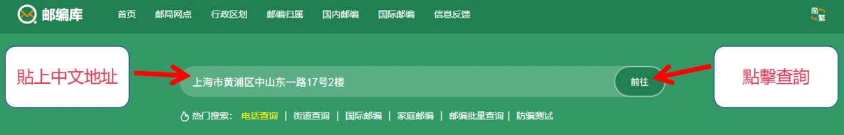 注意:第三方查詢工具僅提供中文(簡體中文或繁體中文皆可使用),請直接將欲寄送的中文地址複製並貼上至第三方連結的搜尋框中。具體指引如下: